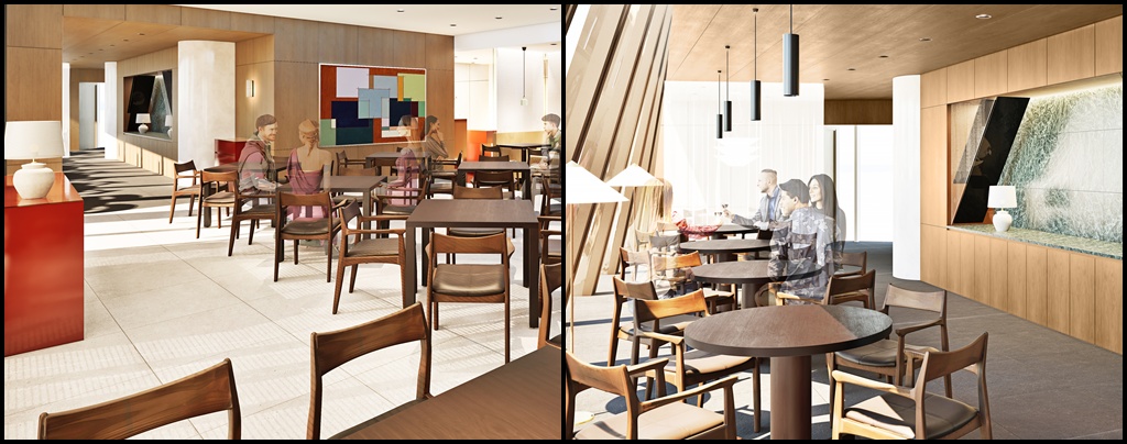 2面の窓から自然光が降り注ぐ、広がりと明るさを感じさせるメインダイニングにおいては、世界を舞台に活躍するアーティストによるアートを配置。ダイニング奥のエリアは、原宿クエストのデザインアーキテクトを務めた建築設計事務所「OMA」の代表・重松象平氏による傾斜したサッシとブレースや、台湾を彷彿とさせるグリーンの大理石の素材感を活かしたデザインとしています。窓際に配置された個室では、表参道を見下ろしながら特別な食事のひとときをお楽しみいただけます。